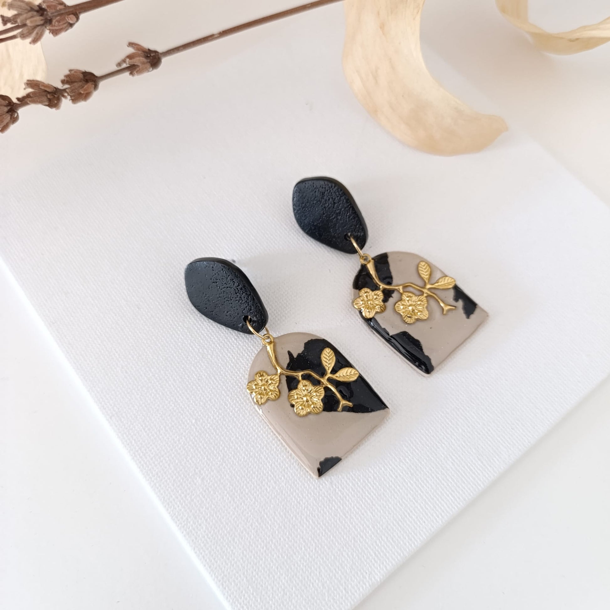 Entre as cores bege e preto com uma aplicaçao em aço dourado, são elaborados em argila polimérica e acabamento em resina.